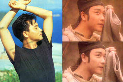 我一直弄不清楚,为什么《阿飞正传》和“告别”相隔时间不长,前者的身型如此标准,而到了告别就突然暴肥了一把。现在想来如果告别上的Leslie如旭仔般,怕不一定能压得住场,而旭仔如果肥肥的,呵呵,我也不敢想象。所以说Leslie这家伙确实厉害,他似乎可以随意增减体重来适应角色的无穷变换。