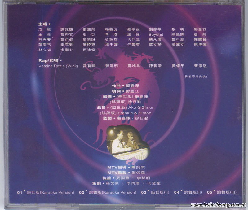 主唱:成龙、张国荣、谭詠麟、梅艳芳、张学友、刘德华、黎明、郭富城、王菲、郑秀文、那英、李玟、赵薇、Beyond、陈慧娴、彭羚、许志安、郑伊健、陈慧琳、梁咏琪、古巨基、苏永康、郑中基、谢霆锋、陈奕迅、李克勤、陈晓东、杨千嬅、任贤齐、莫文蔚、梁汉文、马浚伟、林心如、金海心、何味奇