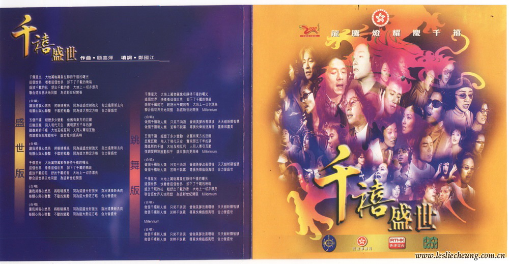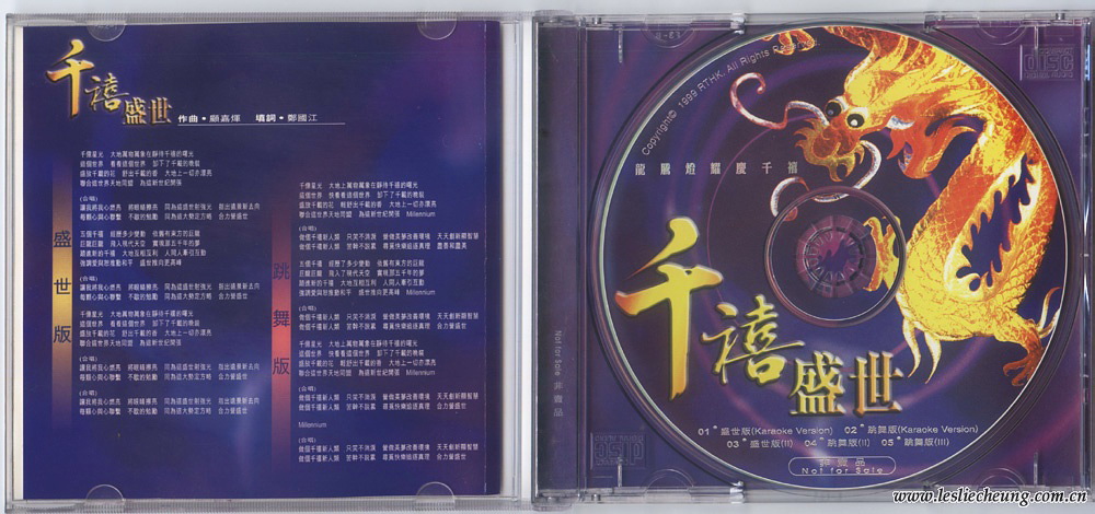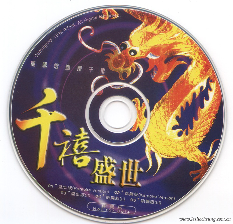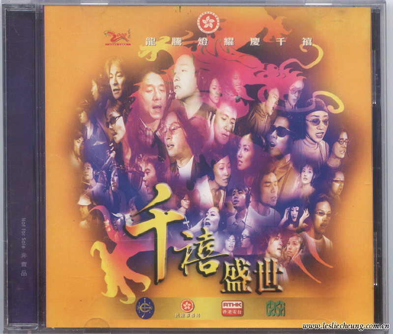 1999年香港电台RTHK为迎接千禧年,举办“龙腾灯耀庆千禧”活动,打破各大唱片公司门户之嫌,联合港台内地35位歌手和影视明星专门录制歌曲“千禧盛世”。由香港著名作曲家顾嘉煇先生亲自谱曲,并联同著名音乐人徐日勤共同监制,由35位明星录制5个不同编曲版本。并推出了一张非卖品 ( Not for Sale)的AVCD作派台宣传,包括两个版本的MV (Karaoke Version) 和三个版本的音频歌曲。